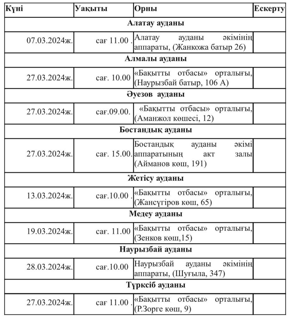 Алматы қаласының әкімі бекіткен кестеге сәйкес, 2024 жылдың наурыз айында аудан әкімдері көпбалалы аналармен 8 кездесу өткізеді.
