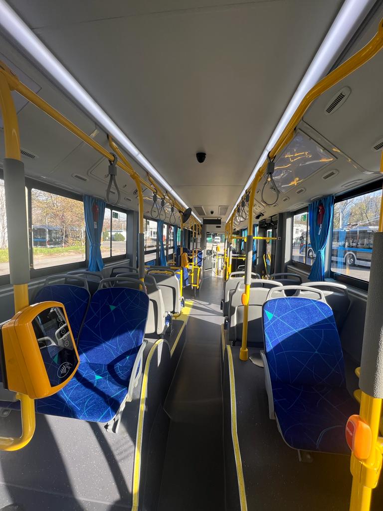 В салоне на 90 мест есть система видеонаблюдения, USB-разъемы для зарядки телефонов и мощный кондиционер. В кабине установлена современная электроника, в том числе бортовой самописец, который фиксирует действия водителя.