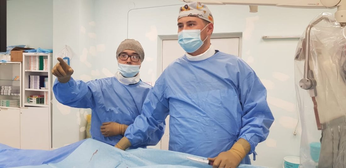 «Так как стент — это металл, инородное тело, то организм будет пытаться отторгать его, поэтому стент покрывается специальным веществом — лекарственным средством, которое подавляет отторжение. И чтобы процесс шёл плавно, необходимо, чтобы кровь была жидкая. Поэтому всем стентированным пациентам нужно принимать антиагрегантную терапию. Под руководством Сакена Мурасовича мы успешно выполнили бифрукационное стентирование, киссинг баллонирование с использованием техники Т-стентирования», — прокомментировал интервенционной хирург Данияр Каралиев.