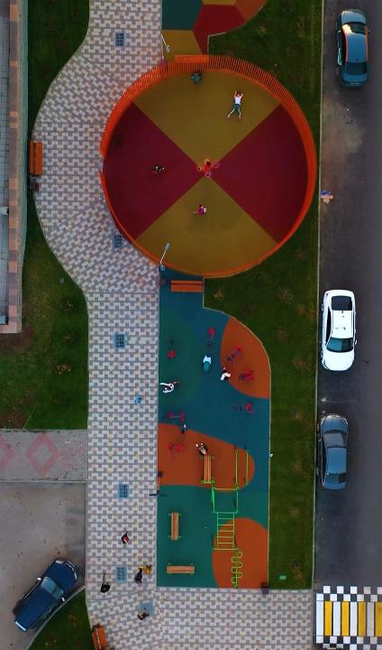 Часть пешеходной зоны предназначена для маленьких жителей района. Так называемая игровая зона «Город для детей» состоит из разнообразных элементов для лазанья, домиков, крутых горок, лабиринтов, тоннелей, песочниц, лестниц, сеток-паутинок и многих других.