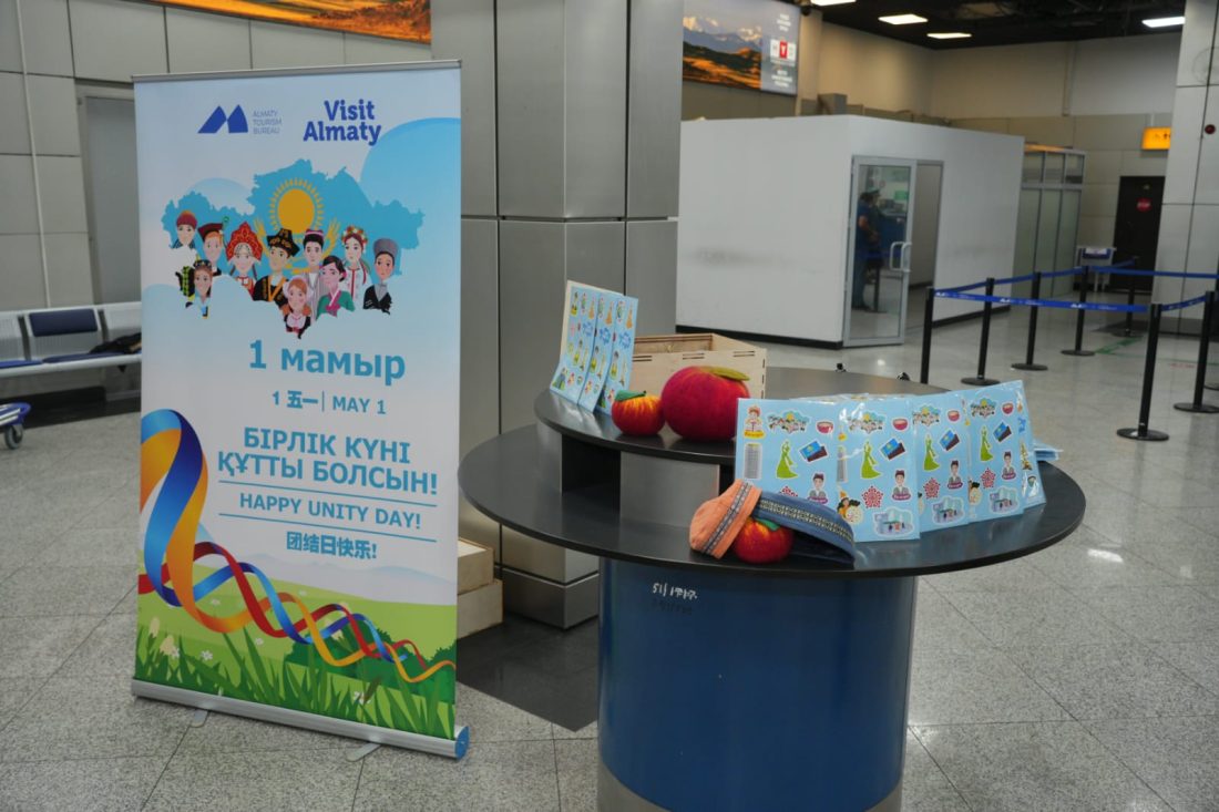 1 мамыр күні Алматы халықаралық әуежайында туристерге естелік сыйлықтар табыс етілді
