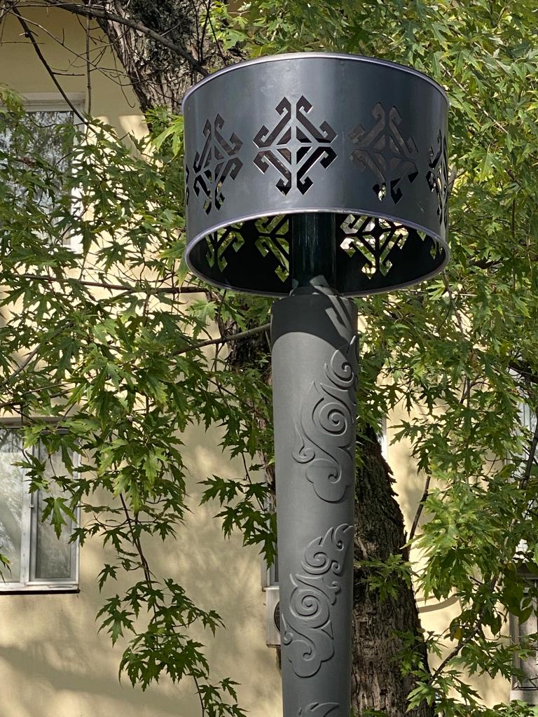 Торшерный светильник разработан специально для города Алматы. Он выполнен в национальном стиле с изображением орнаментов, что придает необычный колорит на тротуарной зоне по вечерам. Торшер целиком металлический с надежными креплениями. Производители старались избежать более хрупких узлов и соединений. Антивандальные они еще и потому, что доступность к источнику света усложнена для избежания поломок.