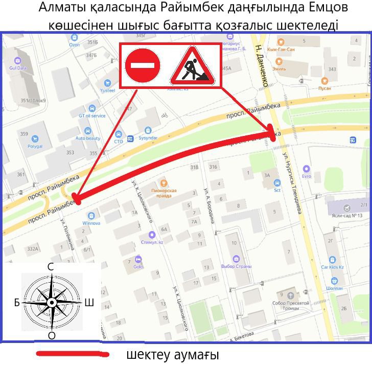 Алматының Алмалы ауданында 30 мамыр күні сағат 23:00-ден 31 мамырдағы сағат 08:00-ге дейін Райымбек даңғылында Емцов көшесінен Н. Тілендиев көшесіне дейін шығыс бағытта көлік қозғалысы ішінара шектеледі. Ал батыс бағыттағы қозғалыс ашық қалады.