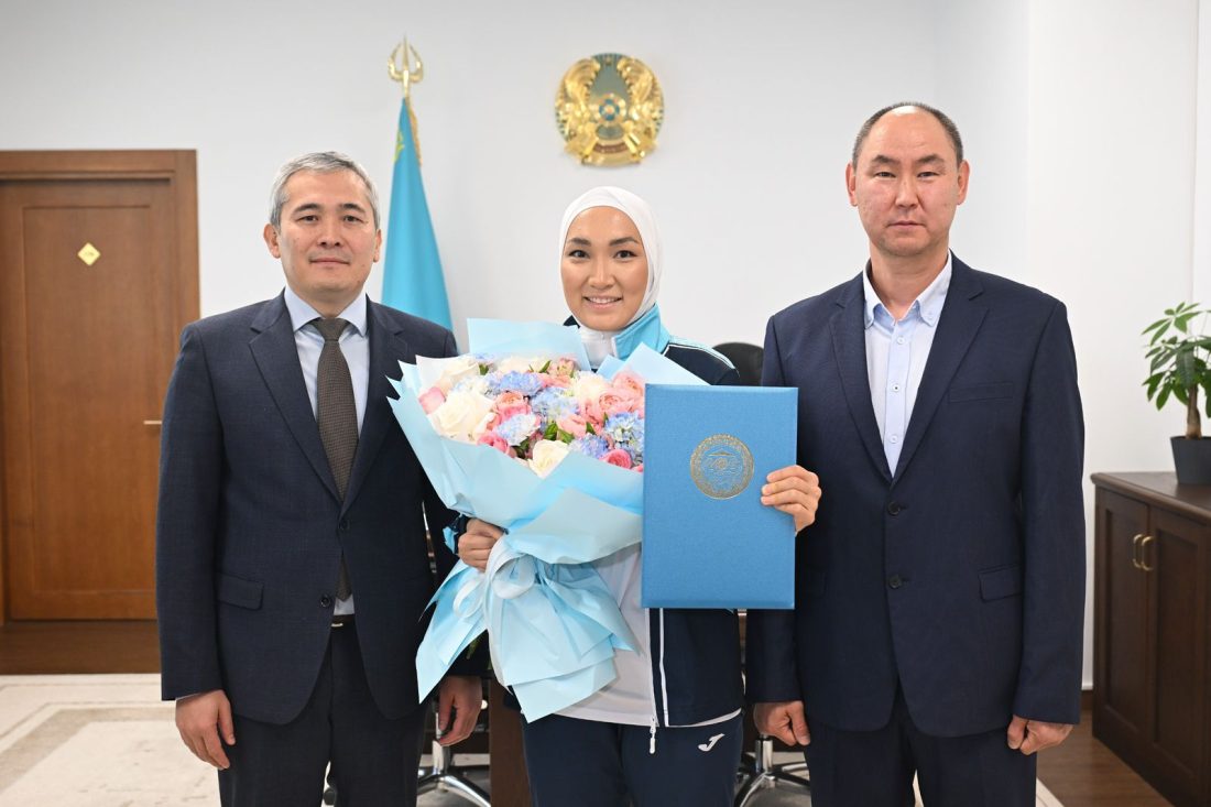Кездесу барысында Бейбіт Шаханов Кәмиля Досмалова мен оның жаттықтырушысына Премьер-Министр Олжас Бектеновтың атынан алғыс хаттар табыс етті.