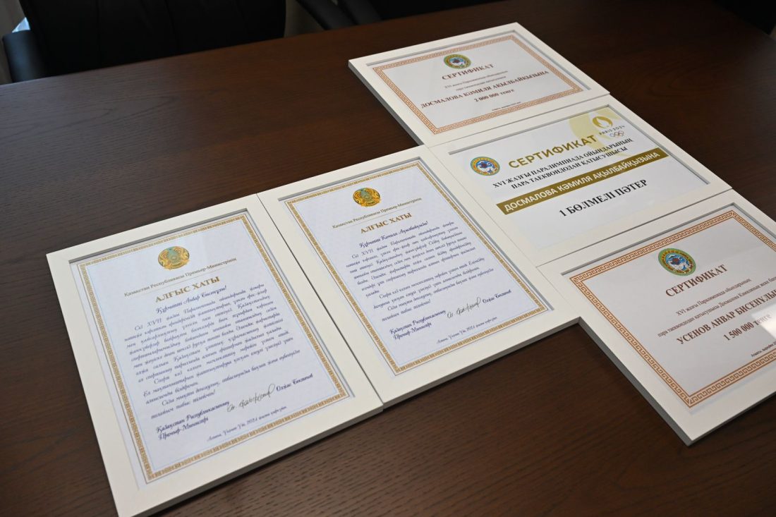 Бейбіт Шаханов сонымен қатар Кәмиля Досмаловаға 2 миллион теңгелік ақшалай сертификат, ал Әнуар Үсеновке 1,5 миллион теңгелік сертификатты тапсырды. Сонымен қатар, спортшыға қызметтік баспана берілді.