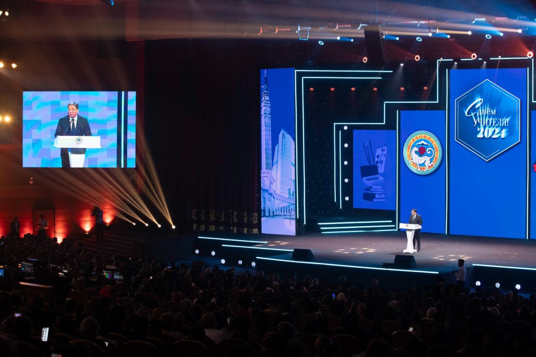 Республика сарайында Алматы әкімі Ерболат Досаев салтанатты іс-шараның басты қонақтарын құттықтап, жас ұрпақты тәрбиелеуге қосқан үлесі мен еңбегі үшін ризашылығын білдірді. Алматыда 24,1 мың педагог жұмыс істейді, оның 20 725-і мемлекеттік мектептерде, 3 375-і жеке меншік мектептерде.