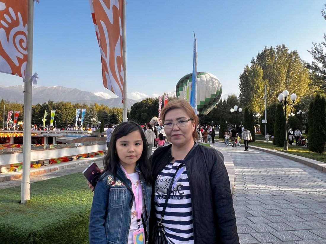 Маленькая гостья праздника, 9-летняя Кәусар, пришла на праздник с мамой Айнур: