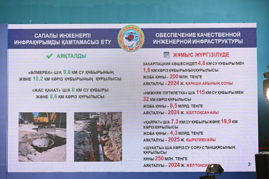 Қала басшысының айтуынша, биылғы қыркүйек айында Спасск және Бекмаханов, Бекмаханов және Сүйінбай көшелерінде жалпы ұзындығы 2,1 км жылу желілері салынды. Сонымен қатар, 30 жылдан астам уақыт бұрын салынған құбырлар ауыстырылды.