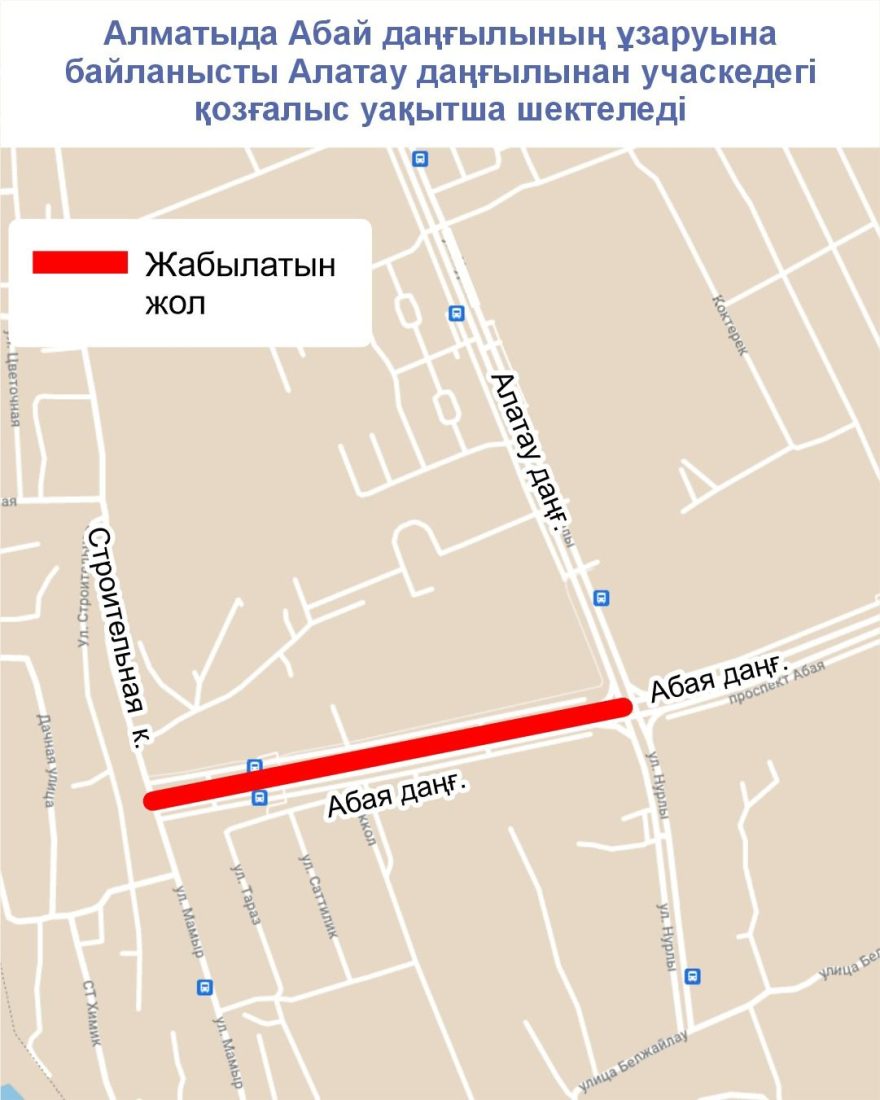 Мәселен, 19 қыркүйекте 23.00-ден 29 қыркүйекте 23.00-ге дейін Алатау даңғылынан Строительная көшесіне дейінгі учаскеде қозғалыс жабылады.