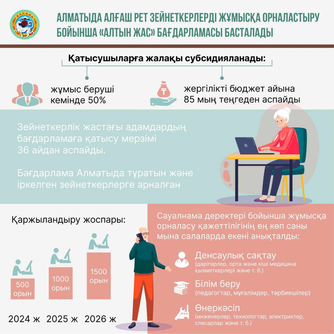 Алматыда алғаш рет зейнет жасындағы адамдарды жұмысқа орналастыруға арналған «Алтын жас» бағдарламасы іске қосылады. Қаланың Жұмыспен қамту және әлеуметтік бағдарламалар басқармасының басшысы Бауыржан Жаубасовтың айтуынша, 2024 жылы кемінде 500 адам, 2025 жылы 1000 адам, 2026 жылы 1500 адам қамтылады.