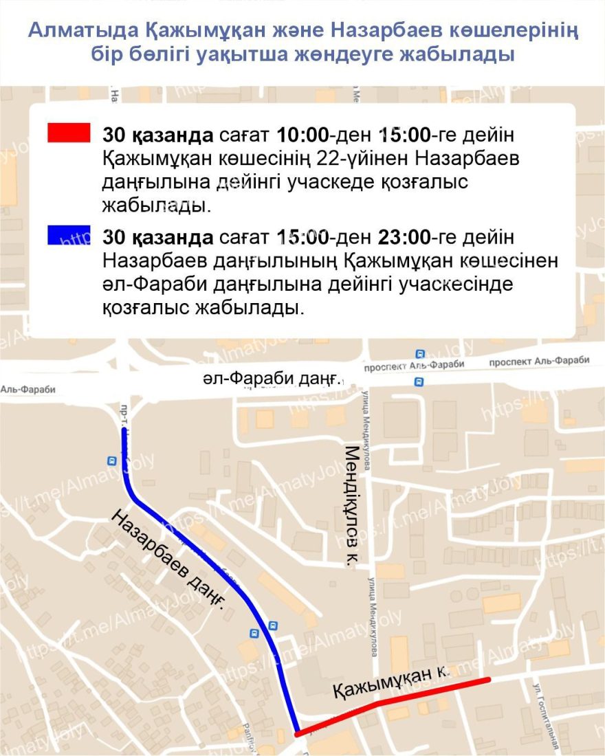 30 қазанда сағат 10.00-ден 15.00-ге дейін Қажымұқан көшесінің 22-үйінен Назарбаев даңғылына дейінгі учаскеде қозғалыс жабылады. Бұл аумақты Достық даңғылы мен С. Байжанов көшесі арқылы айналып өтуге болады.