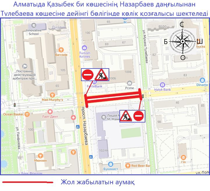 11 қазан сағат 13:00-ден 12 қазан сағат 13:00-ге дейін Алматының Медеу ауданында Назарбаев даңғылынан Төлебаев көшесіне дейінгі Қазыбек би көшесінде көлік қозғалысы екі жаққа да жабылады.