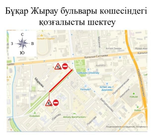 2024 жылдың 17 қыркүйегінде сағат 22:00-ге дейін Алматы қаласы Бостандық ауданында Бұқар жырау желекжолы бойында Байтұрсынов көшесінен Марков көшесіне дейін көлік қозғалысы жабылады.