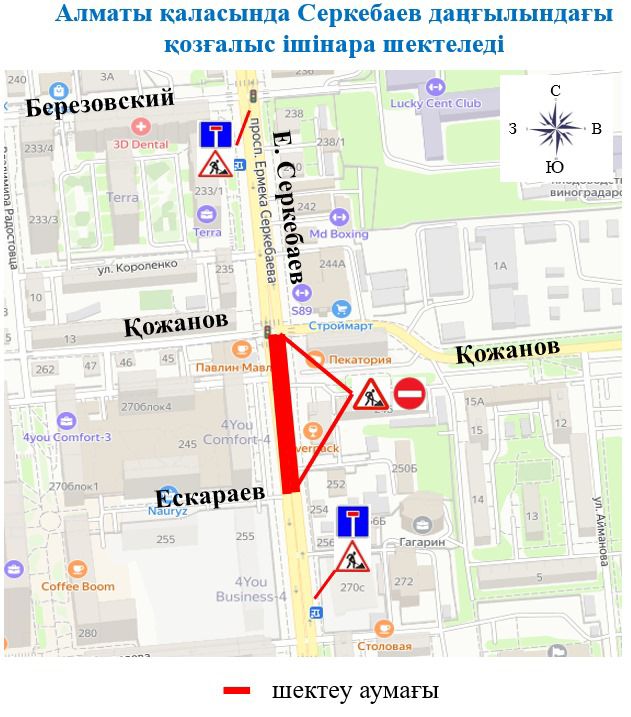 2024 жылдың 22 қыркүйек күні сағат 07:00 бастап 23 қыркүйектің сағат 07:00 дейін Алматы қаласының Бостандық ауданында Е.Серкебаев даңғылы бойынша Есқараев көшесінен Қожанов көшесіне дейін автокөлік қозғалысы жабылады