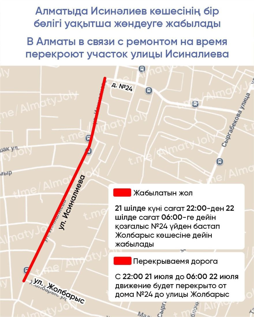 21 шілде күні сағат 22:00-ден 22 шілде сағат 06:00-ге дейін қозғалыс №24 үйден бастап Жолбарыс көшесіне дейін жабылады.
