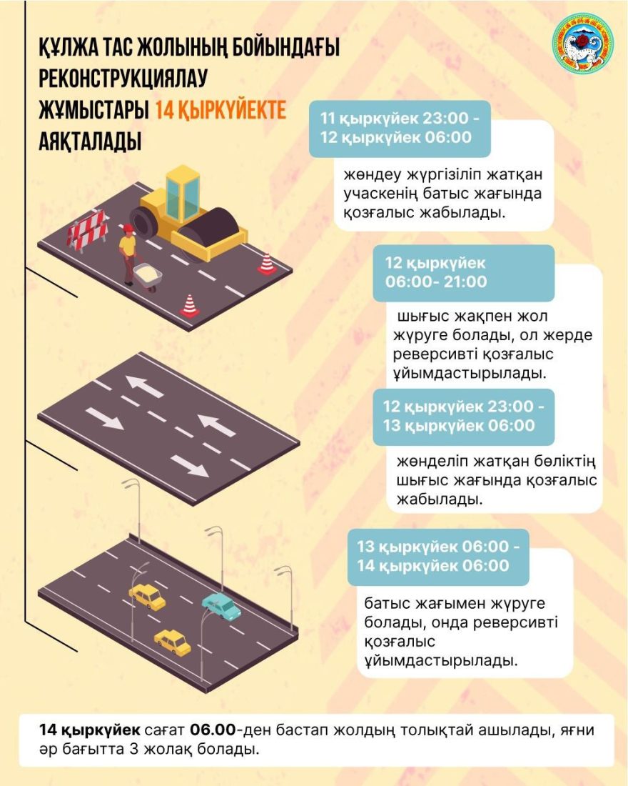 11 қыркүйек сағат 23.00-ден 12 қыркүйек сағат 06.00-ге дейін жөндеу жүргізіліп жатқан учаскенің батыс жағында қозғалыс жабылады. Облыстан қалаға келгенде бұл жерді Талғар тас жолымен, Бұқтырма, Майлин және Приканальная ҮАК көшелері арқылы айналып өтуге болады.