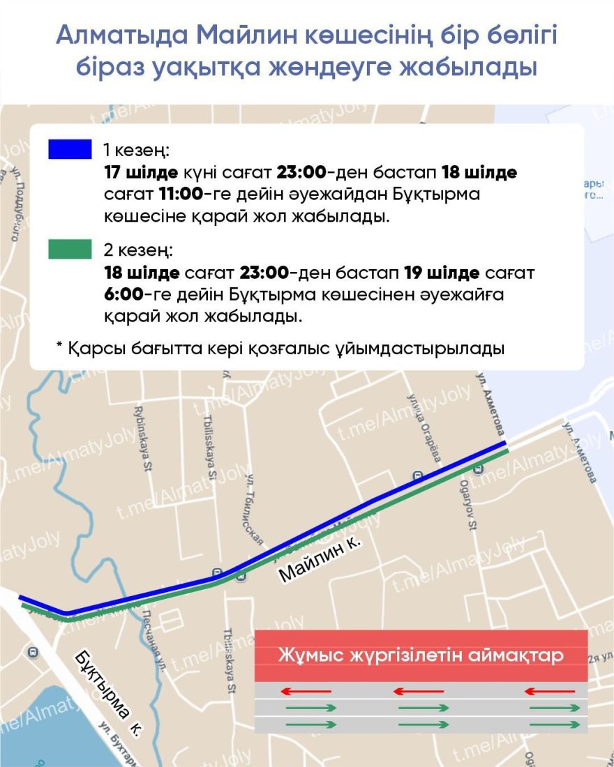 2 КЕЗЕҢ: 18 шілде сағат 23:00-ден бастап 19 шілде сағат 6:00-ге дейін Бұқтырма көшесінен әуежайға қарай жол жабылады. Қарсы бағытта кері қозғалыс ұйымдастырылады.