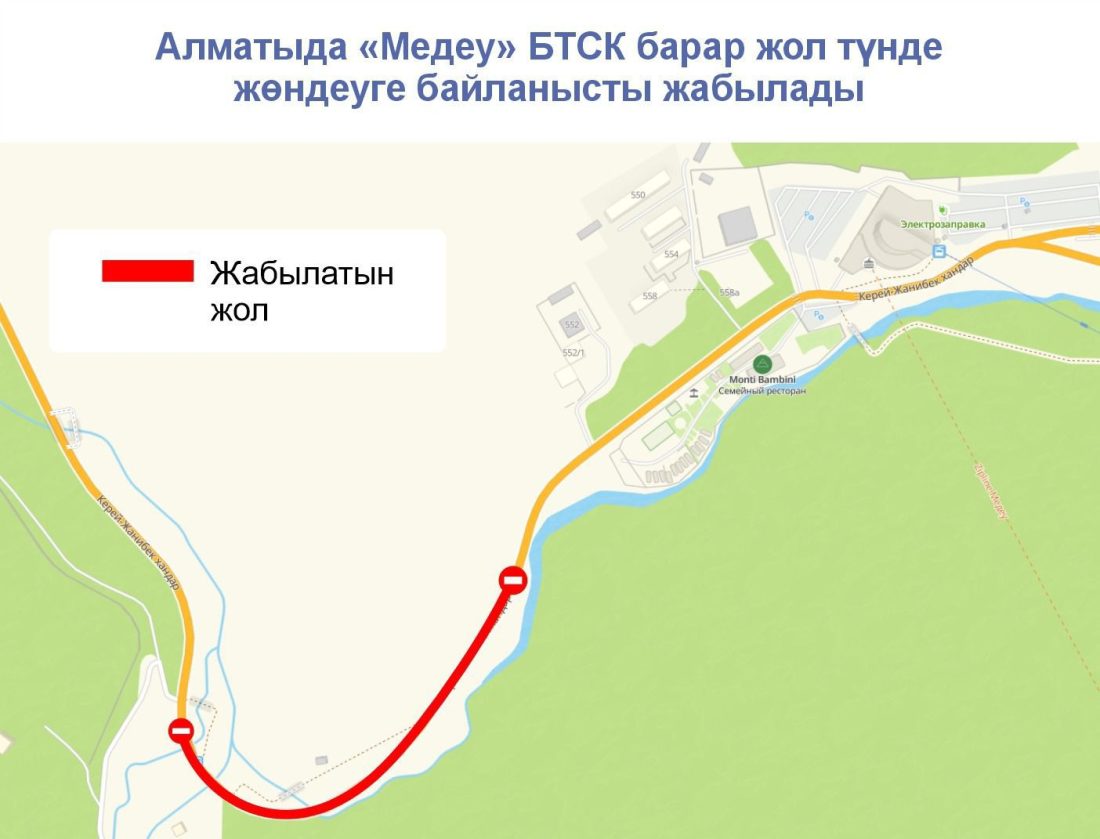 16 тамыз сағат 23:00-ден 17 тамыз 07:00-ге дейін «Ақбұлақ» бұлағынан 500 метр ұзындықтағы «Медеу» БТСК бағытындағы учаскеде қозғалыс жабылады.