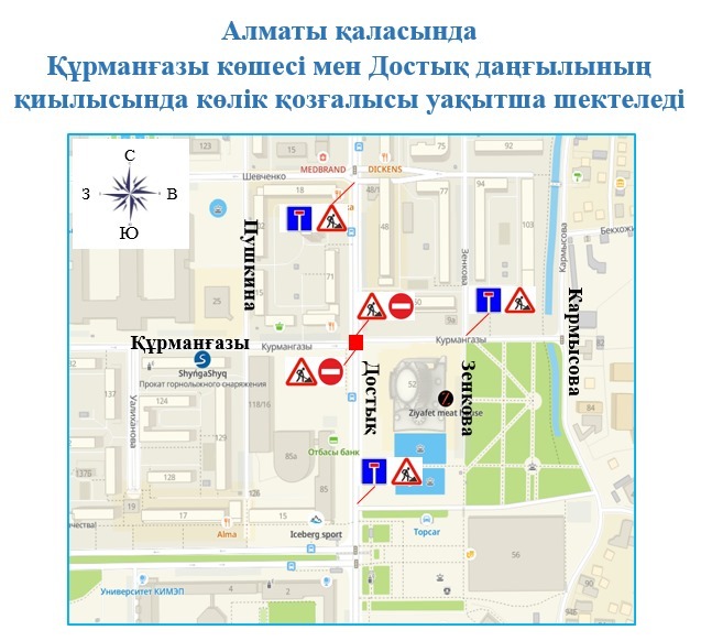 21 маусымда сағат 23.00-ден 22 маусымдағы сағат 09.00-ге дейін Алматыдағы Медеу ауданында Құрманғазы мен Достық көшелерінің қиылысында автокөлік үшін қозғалыс жабылады.