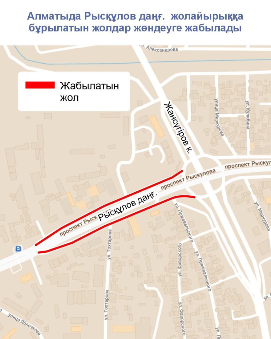 5 қыркүйек сағат 23.00-ден 7 қыркүйек сағат 11.00-ге дейін Рысқұлов даңғылынан Жансүгіров көшесіне дейінгі оңтүстікке бұрылыс пен Жансүгіров көшесінен Рысқұлов даңғылына дейінгі солтүстікке бұрылатын жолда қозғалыс жабылады.