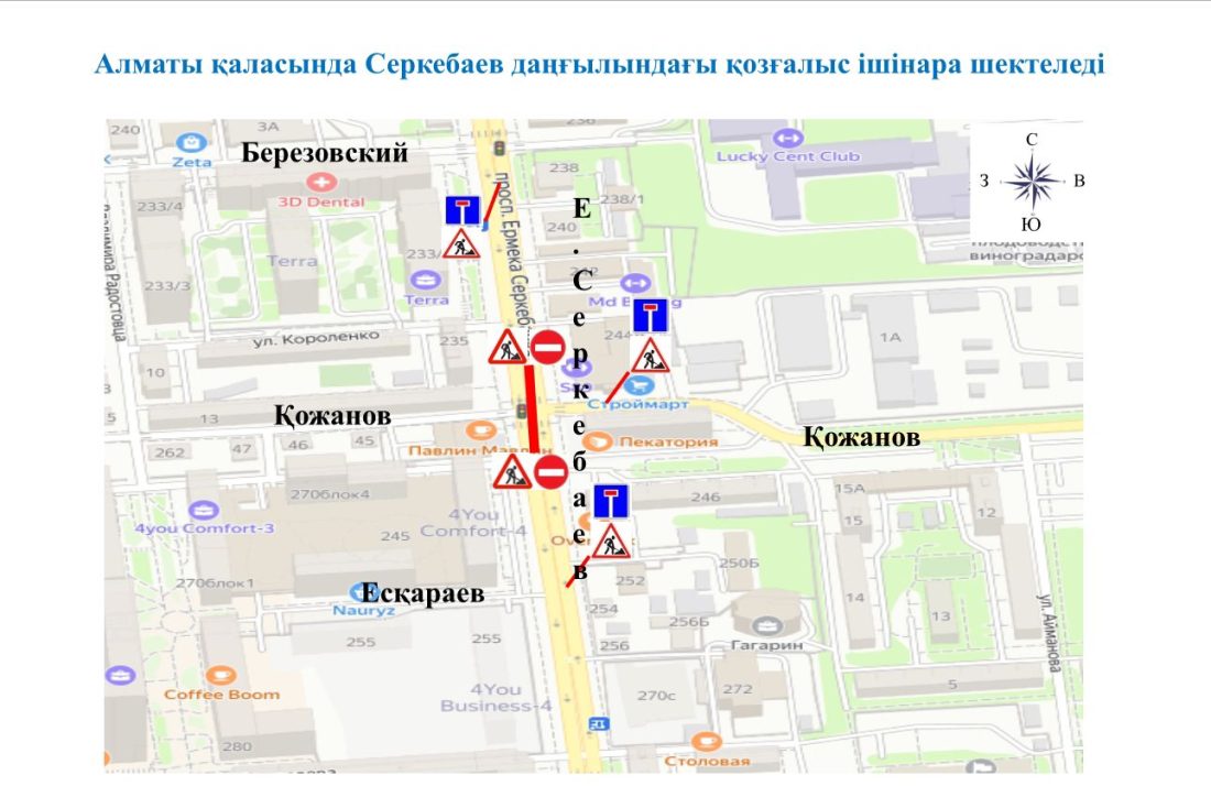 Алматы қаласы Бостандық ауданындағы Ермек Серкебаев даңғылы бойындағы Березовский көшесінен бастап Есқараев көшесіне дейінгі аумақ 10 тамыздағы (сенбі) таңғы сағат 6-дан (сенбі) 13 тамыздағы (сейсенбі) таңғы сағат 10-ға дейін екі бағытта да автокөлік құралдарының қозғалысы үшін жабылады.