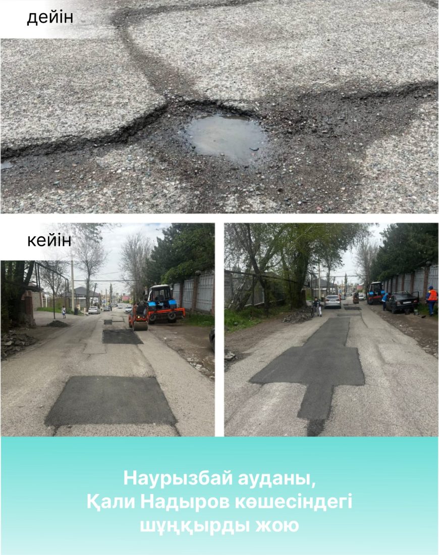 Алматыда ауа райы қолайлы бола салысымен көше-жол желісін ағымдағы жөндеу жұмыстары белсенді жүргізіліп жатыр. Әр ауданның мердігерлік ұйымдары мониторинг барысында және қала тұрғындарының түрлі арналар арқылы келіп түскен өтініші негізінде анықталған шұңқырларды жөндейді.