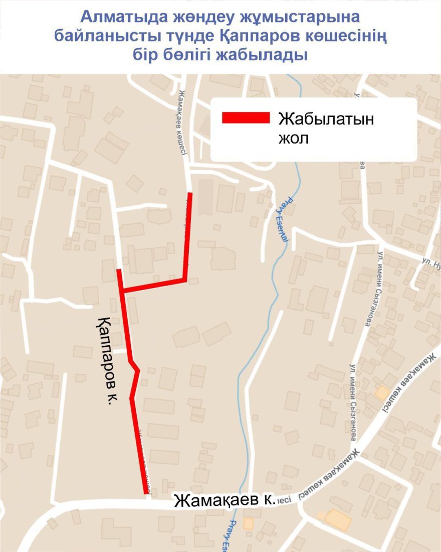 9 тамыз сағат 23:00-ден 10 тамыз сағат 06:00-ге дейін Жамақаев көшесінен бастап «MEDITERRA» медициналық орталығына дейінгі аралықта қозғалыс жабылады.
