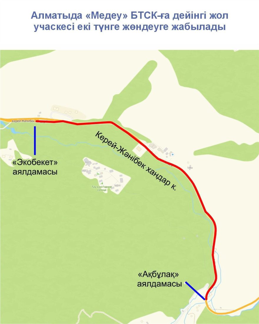 Мәселен, 23:00-ден 27 және 28 Тамызда 06: 00-ге дейін қозғалыс «Ақбұлақ» бұлағынан селден қорғау құрылымдары мен «Экопост» аялдамасына дейінгі учаскеде жабылады.
