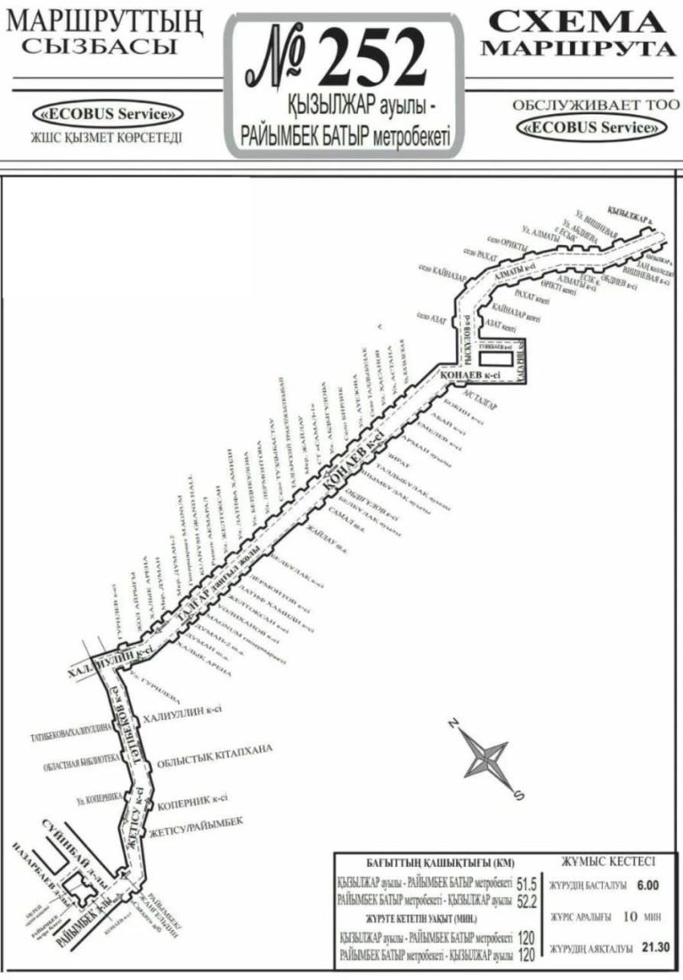 №252 бағытында 25 автобус қызмет көрсетеді, жүру аралығы 10 минут. Бұл бағытқа «ECOBUS SERVICE» ЖШС қызмет көрсетеді.