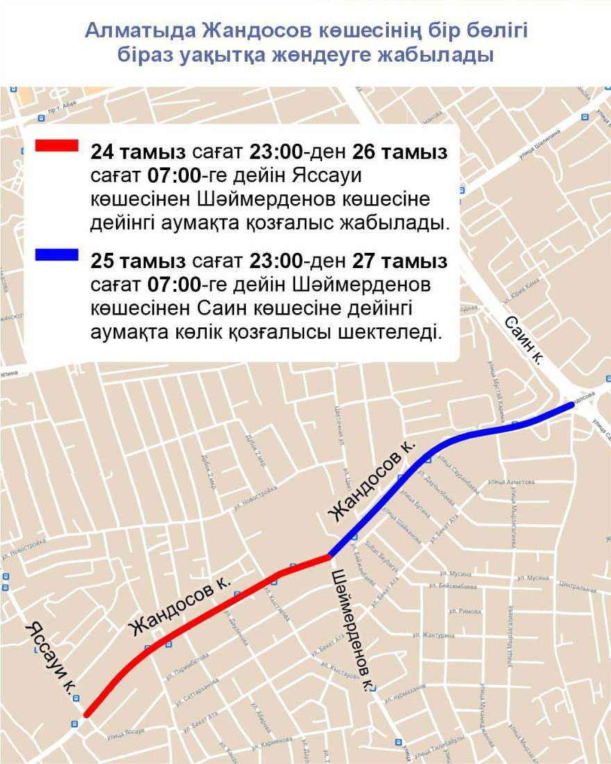 24 тамыз сағат 23:00-ден 26 тамыз сағат 07:00-ге дейін Яссауи көшесінен Шәймерденов көшесіне дейінгі аумақта қозғалыс жабылады.