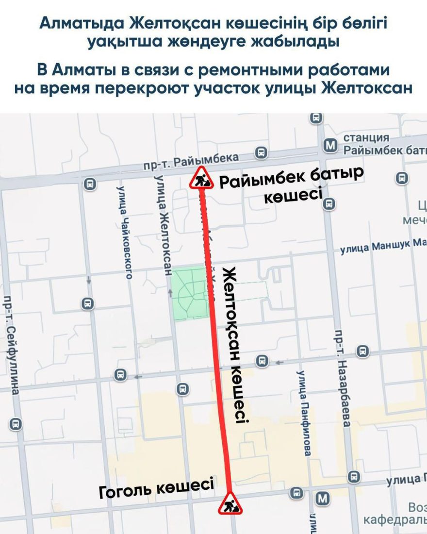 3 шілде күні сағат 08:00-ден 22:00-ге Гоголь көшесінен Райымбек батыр даңғылына дейінгі жолда көлік қозғалысы уақытша тоқтатылады. Бұл аумақты Наурызбай батыр көшесі мен Абылай хан даңғылы арқылы айналып өтуге болады.