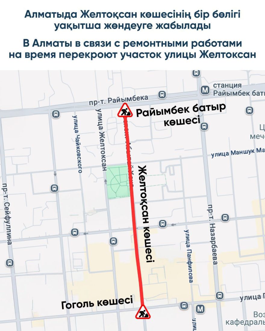 1 шілде күні сағат 08:00-ден 22:00-ге Гоголь көшесінен Райымбек батыр даңғылына дейінгі жолда көлік қозғалысы уақытша тоқтатылады. Бұл аумақты Наурызбай батыр көшесі мен Абылай хан даңғылы арқылы айналып өтуге болады.