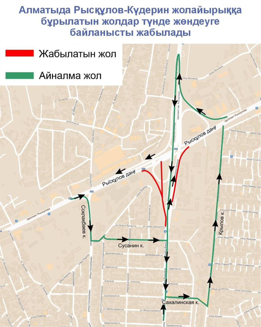 24 шілде сағат 23:00-ден 25 шілде сағат 6:00-ге дейін Рысқұлов даңғылының оңтүстік жағындағы бұрылысқа қарай қозғалыс жабылады.