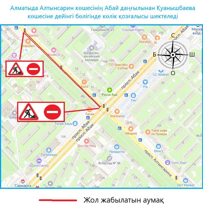 27 қыркүйекте сағат 22:00-ден 28 қыркүйек сағат 08:00-ге дейін Алматы қаласы Әуезов ауданында Алтынсарин даңғылы бойымен №6 қалалық емханадан Абай даңғылына дейін оңтүстік бағытта көлік қозғалысы жабылады.