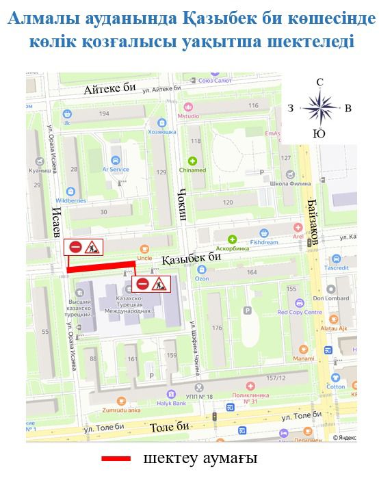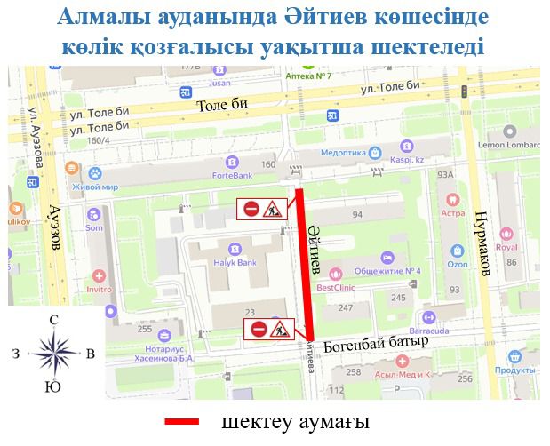 3 маусымнан бастап 6 шілдеге дейін Алматының Алмалы ауданында автокөліктер қозғалысы шектеледі: Әйтиев көшесімен Бөгенбай батыр көшесінен бастап Төле би көшесіне дейін (екі бағытта); Қазыбек би көшесімен Шөкин көшесінен бастап Исаев көшесіне дейін (екі бағытта).