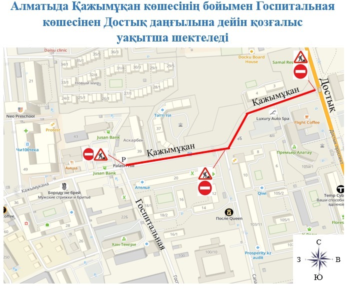 Қажымұқан көшесінің бойымен Госпитальная көшесінен Достық даңғылына дейін 2024 жылғы 27 маусымда сағат 09.00-ден 1 шілдедегі 08.00-ге дейін автокөлік құралдарының қозғалысы жабылады.