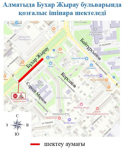 Жоспарлы жұмыстарды жүргізу қауіпсіздігін қамтамасыз ету үшін 2025 жылғы 23 сәуір мен 10 маусым аралығында Бұқар Жырау бульвары бойынша Сергей Марков көшесінен Римский-Корсаков көшесіне дейін оңтүстік жағынан автокөлік қозғалысы ішінара жабылады.