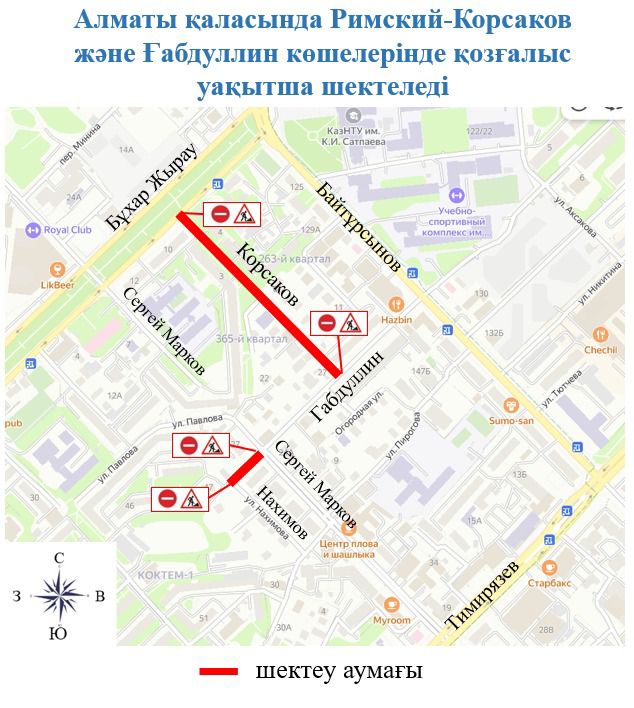 Құрылыс-монтаждау жұмыстарын жүргізу кезінде қауіпсіздікті қамтамасыз ету үшін 2025 жылдың 20 мамырынан бастап 1 тамызына дейін: Римский-Корсаков көшесімен (Бұқар жырау желекжолынан бастап Габдуллин көшесіне дейін); Габдуллин көшесімен (Нахимов көшесінен бастап Марков көшесіне дейін) автокөліктер қозғалысы жабылады.