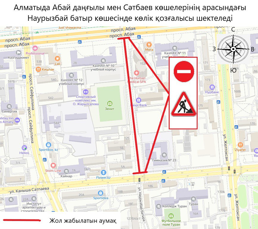 21 маусымда сағат 22.00-ден 23 маусымдағы сағат 12.00-ге дейін Наурызбай батыр көшесінің бойымен Абай даңғылынан Сәтбаев көшесіне дейін.