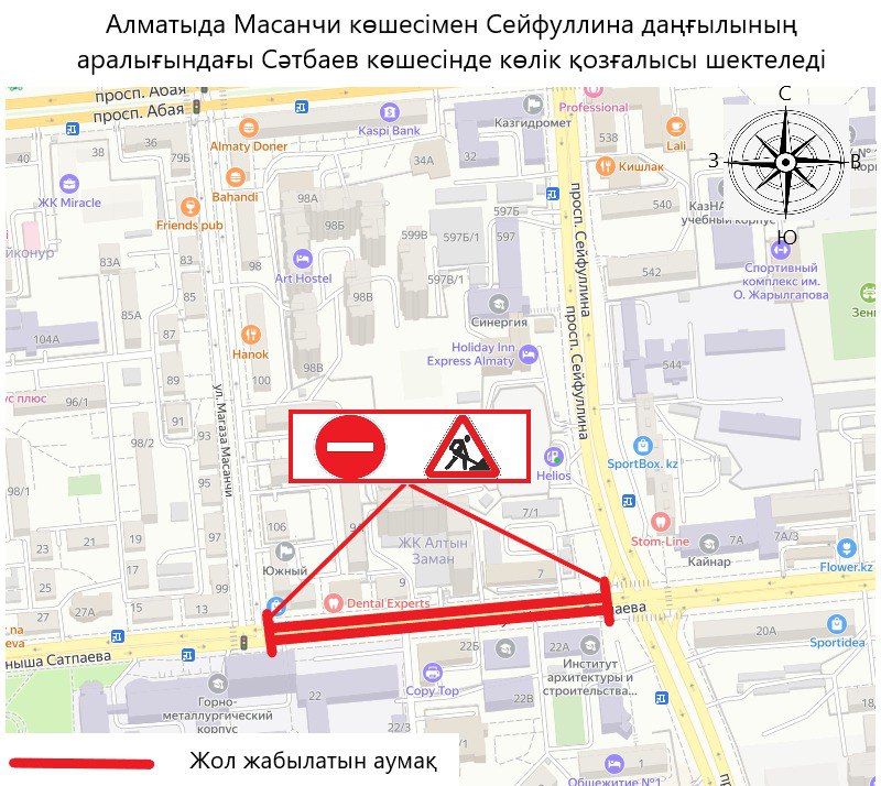 21 маусымда сағат 22.00-ден 22 маусымдағы сағат 12.00-ге дейін Сәтбаев көшесінің бойымен Масанчи көшесінен Сейфуллин даңғылына дейін;