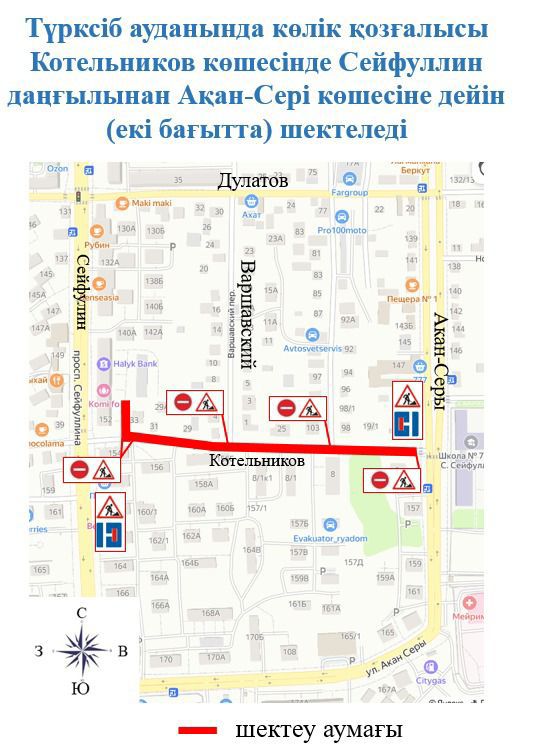 31 мамырдан 30 маусымға дейін Түрксіб ауданында Котельников көшесінің Сейфуллин даңғылынан Ақан Сері көшесіне дейінгі бөлігінде де екі бағытта көлік қозғалысы уақытша тоқтатылады.