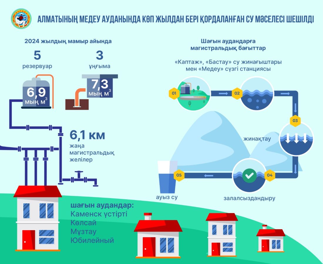 Осылайша, Медеу ауданының инженерлік желілері мен нысандары қолда бар жер асты су жинағыш қуатына қосымша қосылған. «Каптаж», «Бастау» жер асты су қабылдағыштарынан және «Медеу» сүзгі станциясынан түсетін су осы резервуарларда жинақталып, зарарсыздандырылады. Содан кейін сорғылардың белгіленген топтары есебінен ауыз су магистральдық бағыт бойынша Каменск үстіртіне таратылады.