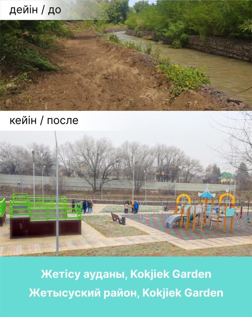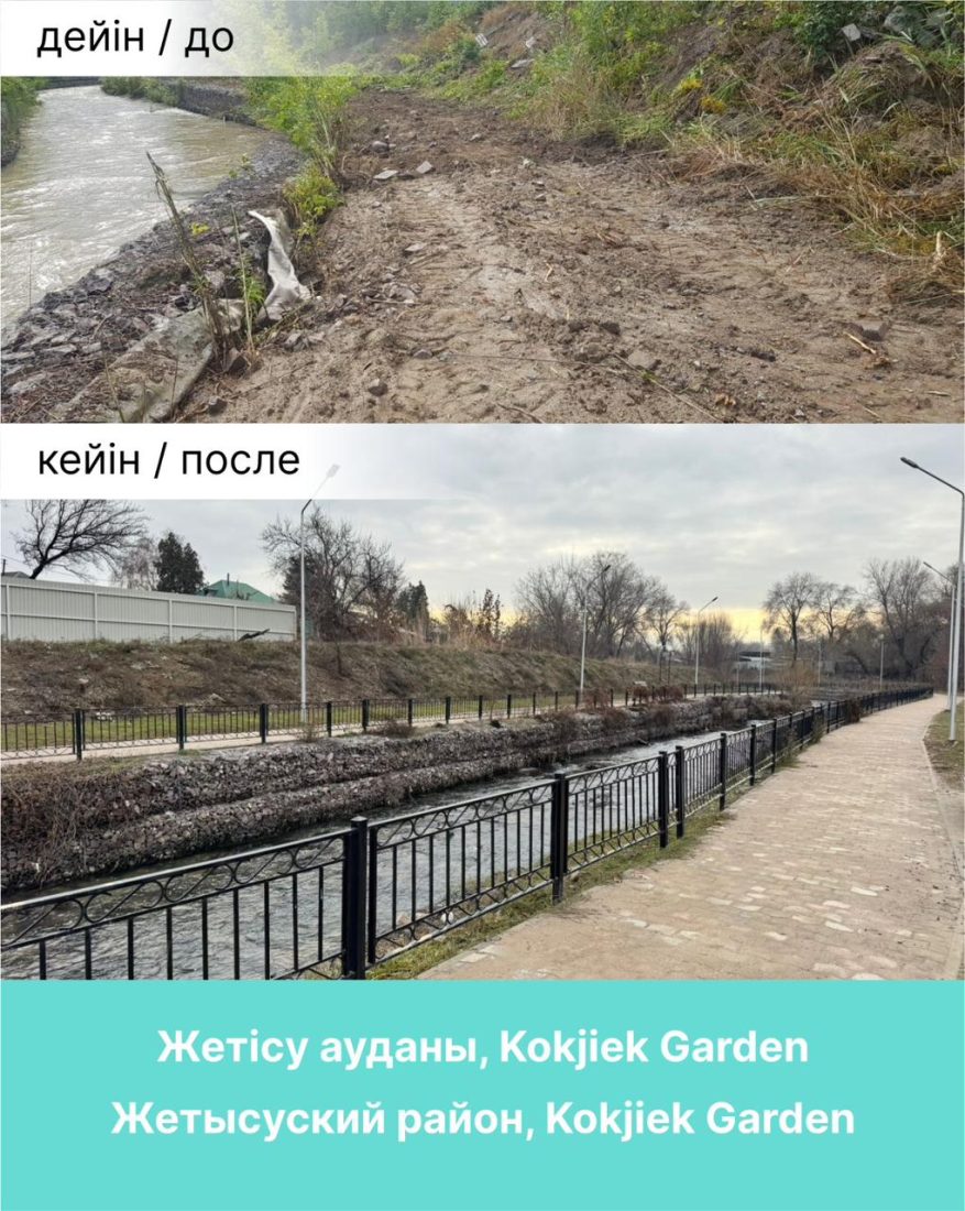 Жетісу ауданы әкімінің айтуынша, 2025 жылы Есентай өзенінің жағасында жайлы серуендеу аймағы құрылатын болады: жасыл желектер отырғызылды, төсеніштер төселді, балалар, спорт, воркаут-алаңдар салынды, авто суару жүйесі, орындықтар, беседкалар, урналар орнатылды.