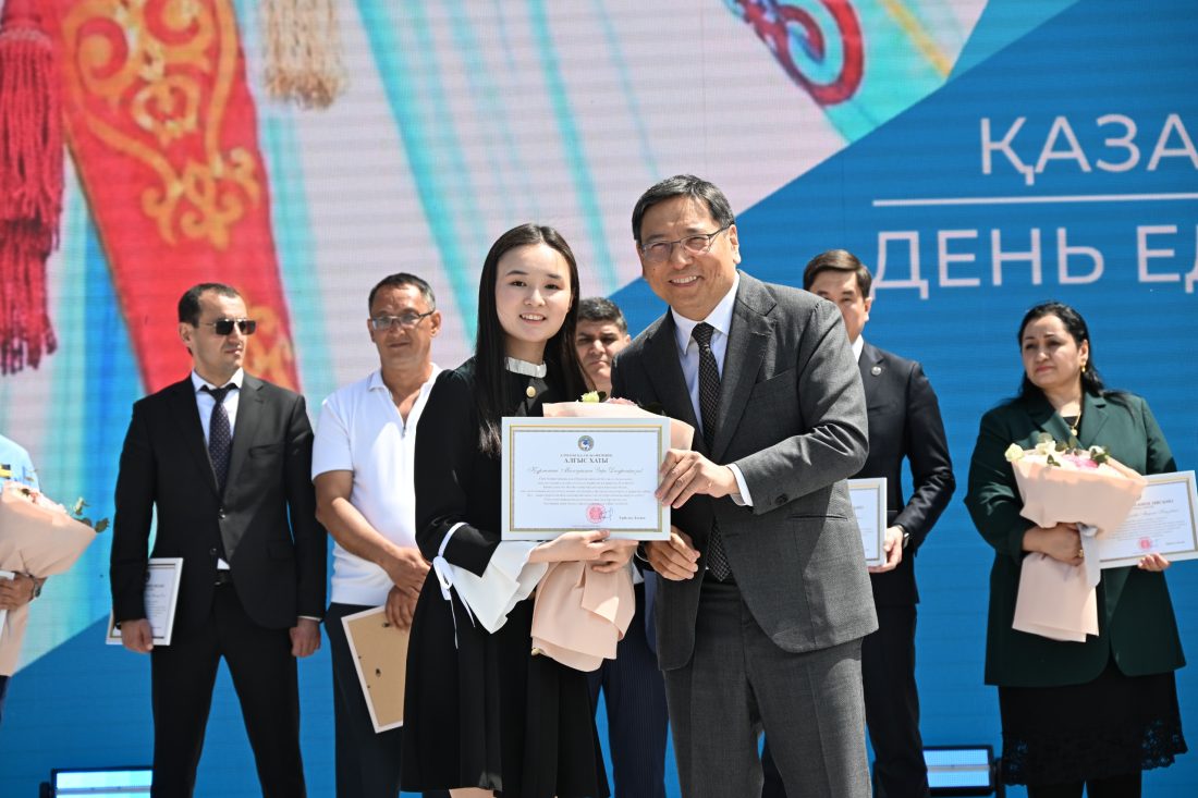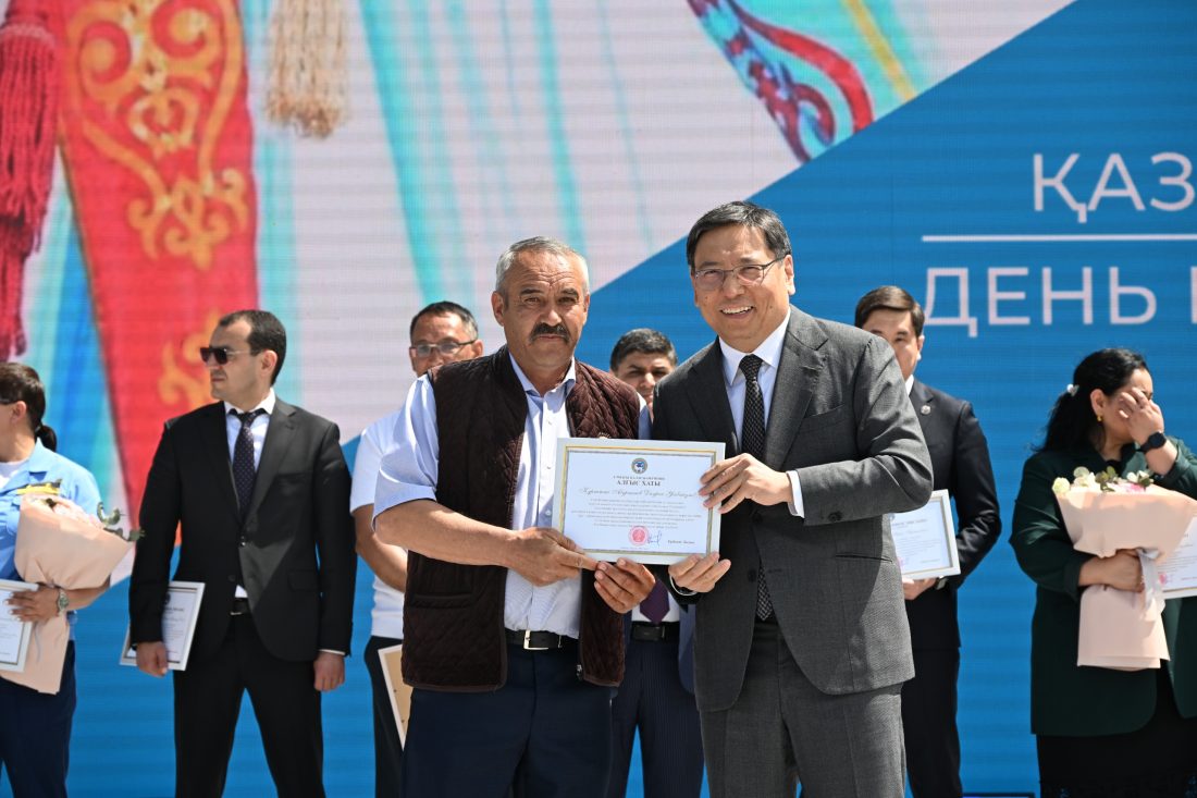 Праздничная программа началась с церемонии награждения волонтеров, гражданских активистов, представителей Ассамблеи народа Казахстана и других участников борьбы с паводками.
