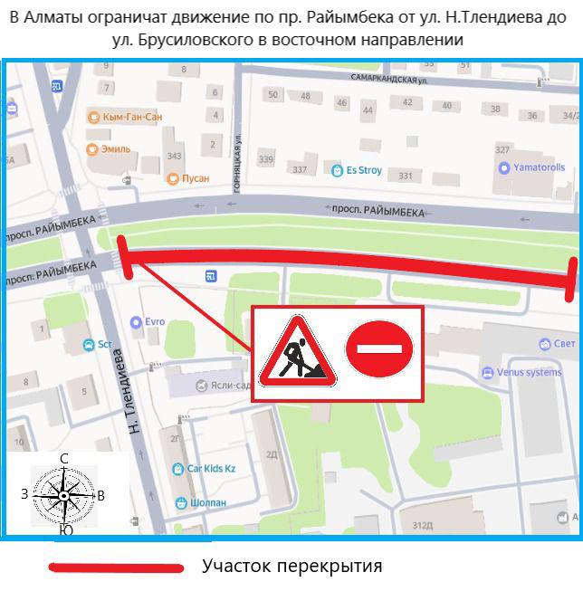 С 23:00 часов 13 июня до 08:00 часов 14 июня движение автотранспорта будет частично ограничено по проспекту Райымбека от улицы Н. Тлендиева до улицы Брусиловского в восточном направлении. Движение в западном направлении останется открытым.