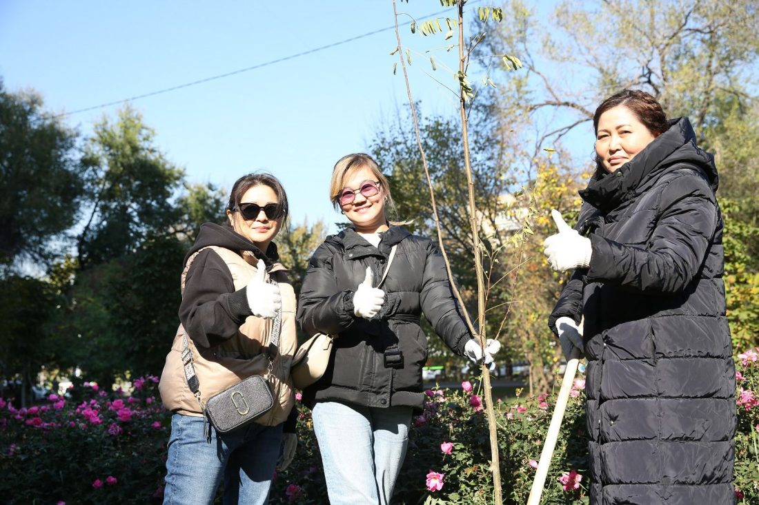 Алмалы ауданында, Махатма Ганди атындағы саябақта таңертеңнен бастап жақын маңдағы үйлердің тұрғындары, түрлі ұйымдардың өкілдері шұңқыр қазып, түскен жапырақтарды жинап, көшеттер отырғызды.